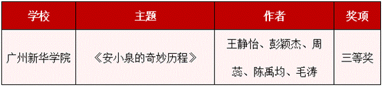 此次大赛共征集全校学生参赛作品14份,并择优推荐参加全国赛。其中,由学生创作的作品《安小泉的奇妙历程》从全国众多参赛作品中脱颖而出,荣获大赛三等奖,同时学校获评“优秀组织奖”,是广东省唯一获奖的民办本科院校。